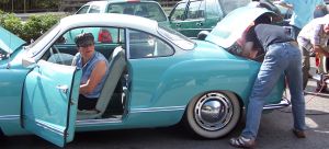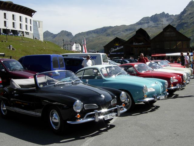 Bei strahlendem Sonnenschein gehts dann auf zur Silvretta-Hochalpenstrasse... ups... ein Karmann will nicht anspringen.... Ralf, Fritz und das gute Händchen von Liliane halfen dem hellblauen Karmann wieder auf die Sprünge...