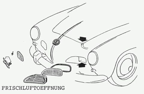 Nach dem Entfernen des Ziergitters (1 Blechschraube) am Boden des Vorgehäuses sieht man einen kleinen Ablaufschlitz. Mit Zündhölzchen durchstossen. Das Wasser sollte dort nach innen in den Reserverad-Kasten laufen und am Wagenboden durch eine Öffnung ins Freie gelangen (Öffnung ist direkt unter Reserverad). Auch diese Abtropf-Öffnung säubern! Das Gitter mit dem Fliegensieb (3 Blechschrauben) herausnehmen. Der zweite Ablaufschlitz befindet sich hinter der Kante, an der die Luftsiebe vor die Luftschächte angesetzt sind. Diese Ablaufschlitze sind meist zugestopft, und das Wasser bleibt stehen (Rostbildung). Vor dem Einbau der Gitter auch gleich die toten Fliegen aus dem Sieb entfernen.